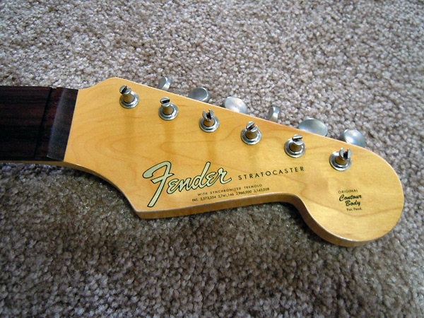 Finally I was ready to track down a neck. MJT has a ebay store and I watched it like a hawk to find what I was looking for. The custom order necks are a pretty penny but often the necks that come up for auction are just as nice and a huge savings. At the time, they were finishing and aging only Allparts necks (now I believe they are using a few other brands too). I found an SRO-FAT which is exactly that, FAT... an inch thick up and down the neck. I was shocked at how big it felt at first but now I love it! Having said that, if you have small hands I'd avoid it. Mine are average sized and if they were any smaller playing this neck would be a challenge. I also managed to track down a convincing headstock decal. They're available from various sources, some are good and some are not. Because they are essentially counterfeit, the sites that offer them come and go. I'm fearful that sharing my source will again cause them to vanish from the web so you'll have to track them down on your own, but good repros are available.